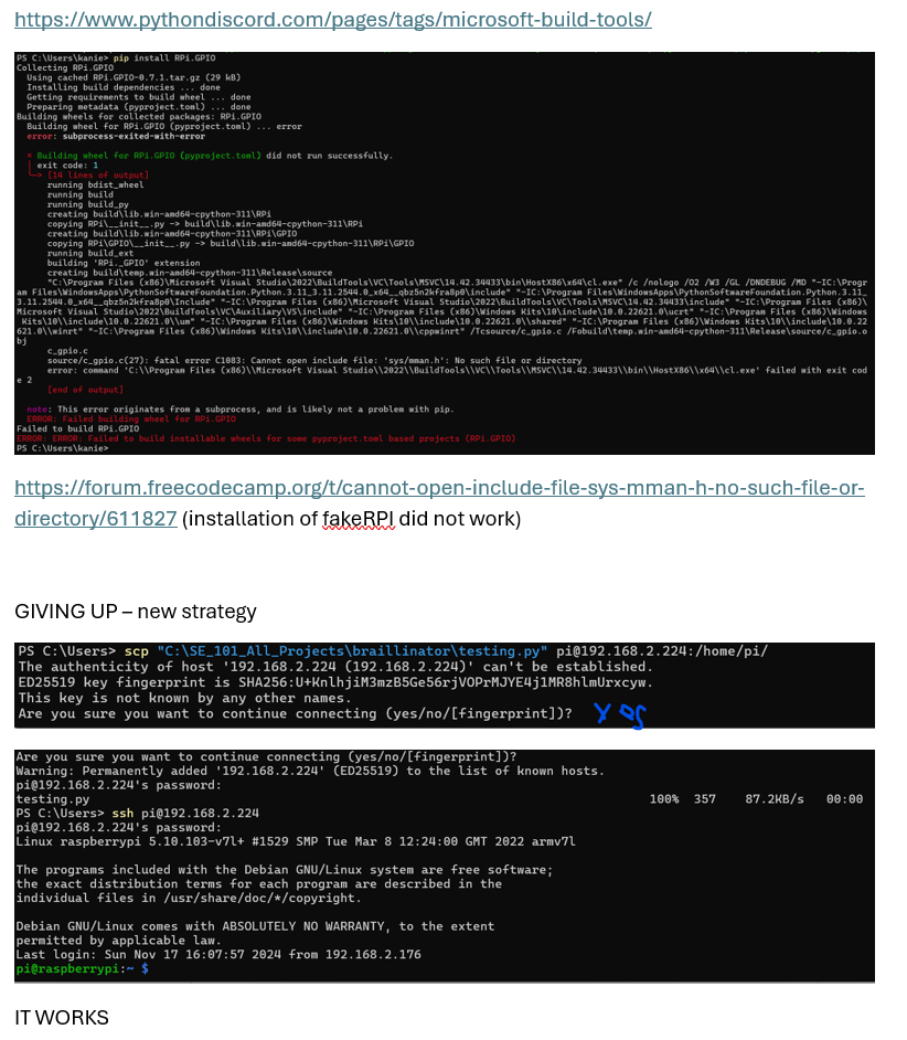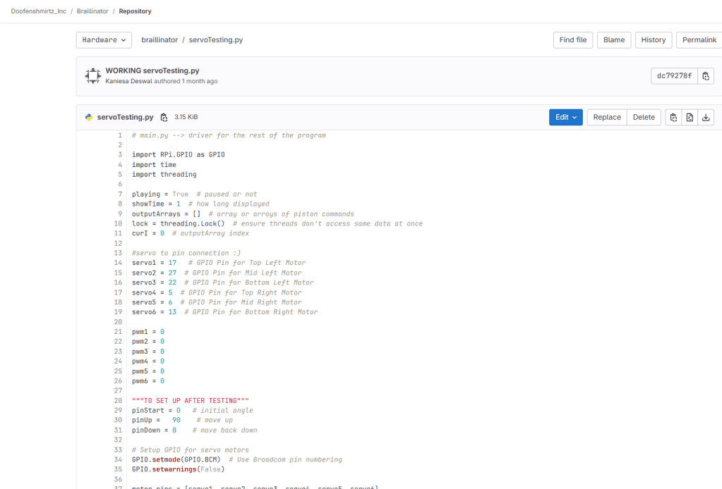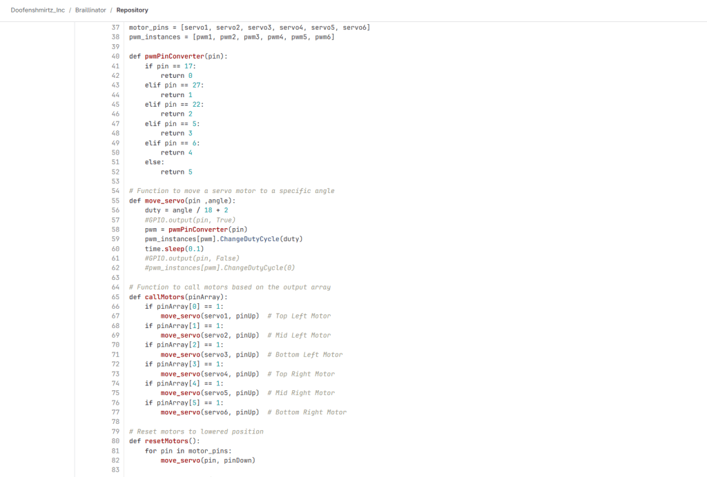 - Integrating the hardware servo code with the software braille translation code was surprisingly tricky.