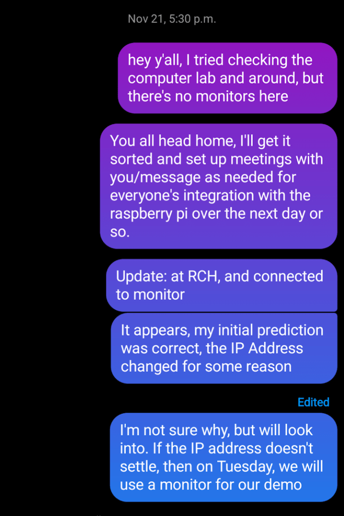 See, with everyone falling slightly behind on their individual tasks due to unexpected troubleshooting, we knew we had to speed things up to meet our deadline. This meant delegating our time and breaking down our tasks into the MVP that would get us to group integration, an unknown variable in regards to how much debugging and fine-tuning would be required. And so, hunting down available monitors, keyboards, and computer mouses (mice?) on campus it was.